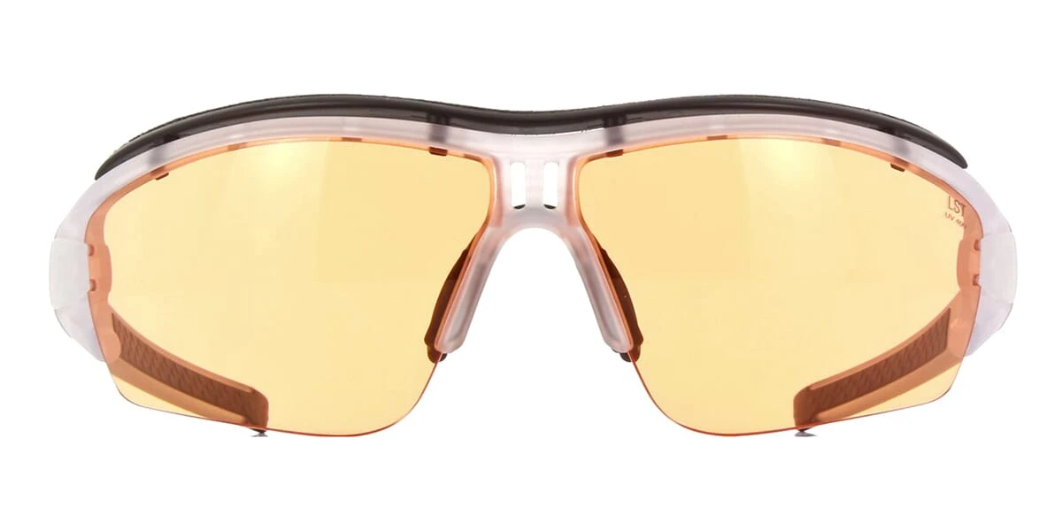 This wraparound Adidas sunglass comes in a matte crystal frame with brown and persimmon anti fog interchangeable lens lenses.