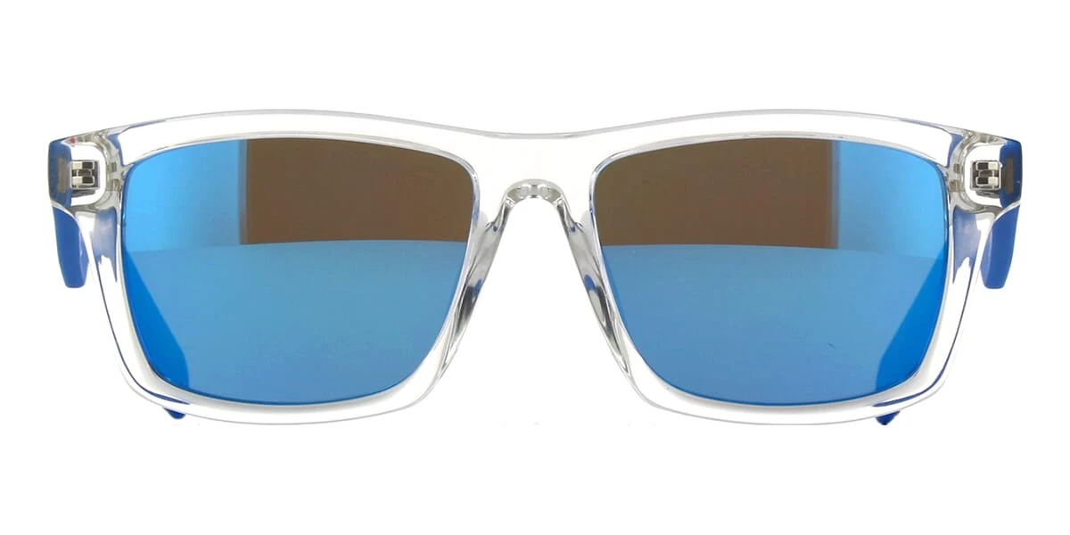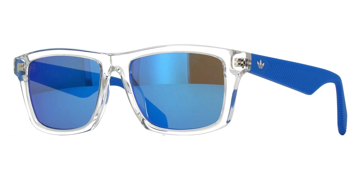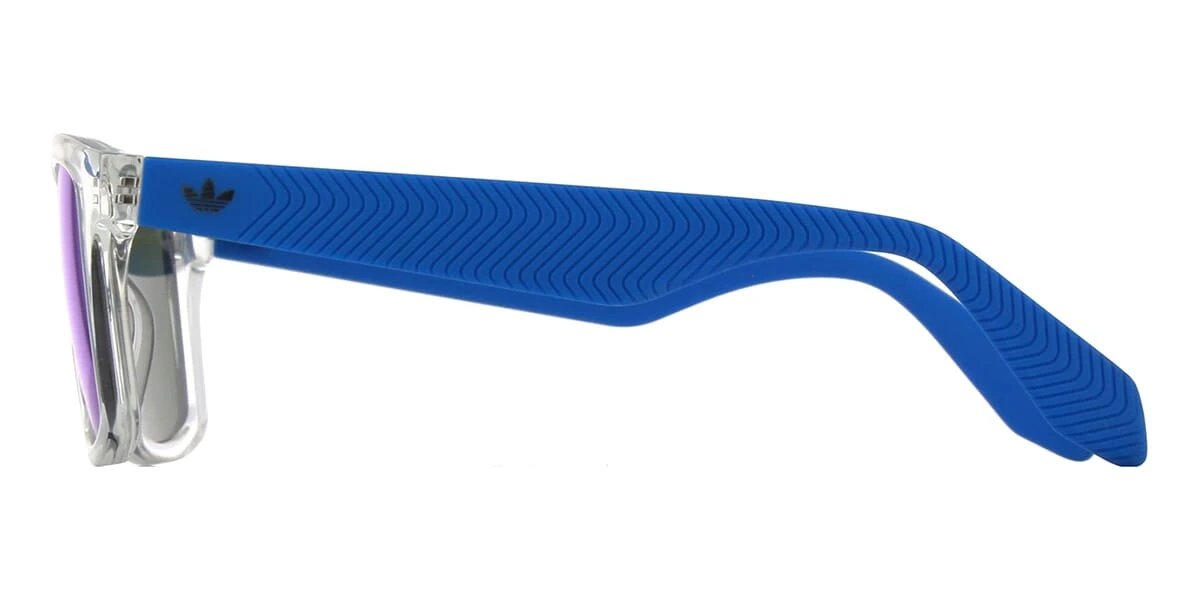 This square Adidas sunglass comes in a crystal with matte blue rubber frame with brown with blue mirror lenses.