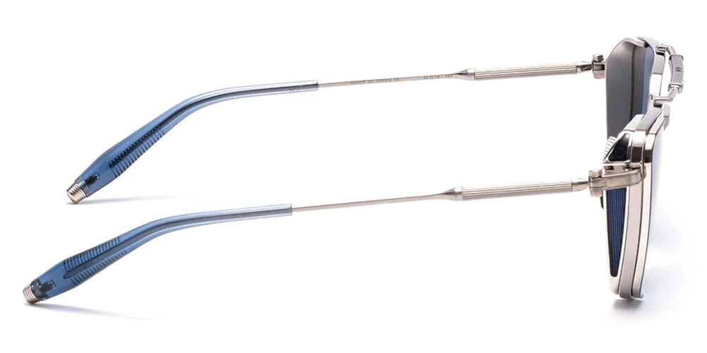 This square Akoni sunglass comes in a brushed black palladium with silver frame with blue lenses.