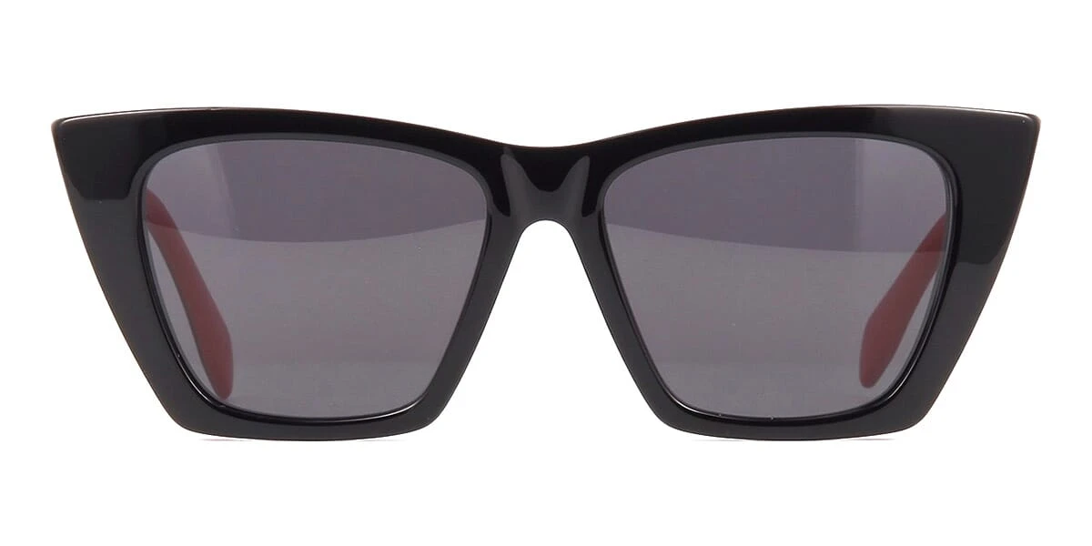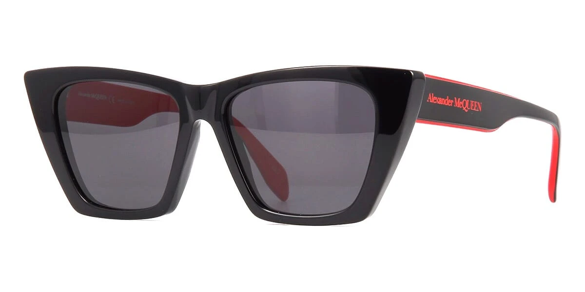 This cat eye Alexander McQueen sunglass comes in a black and red frame with grey lenses.
