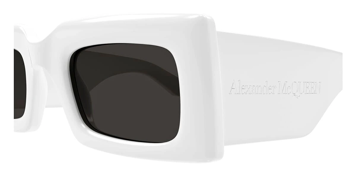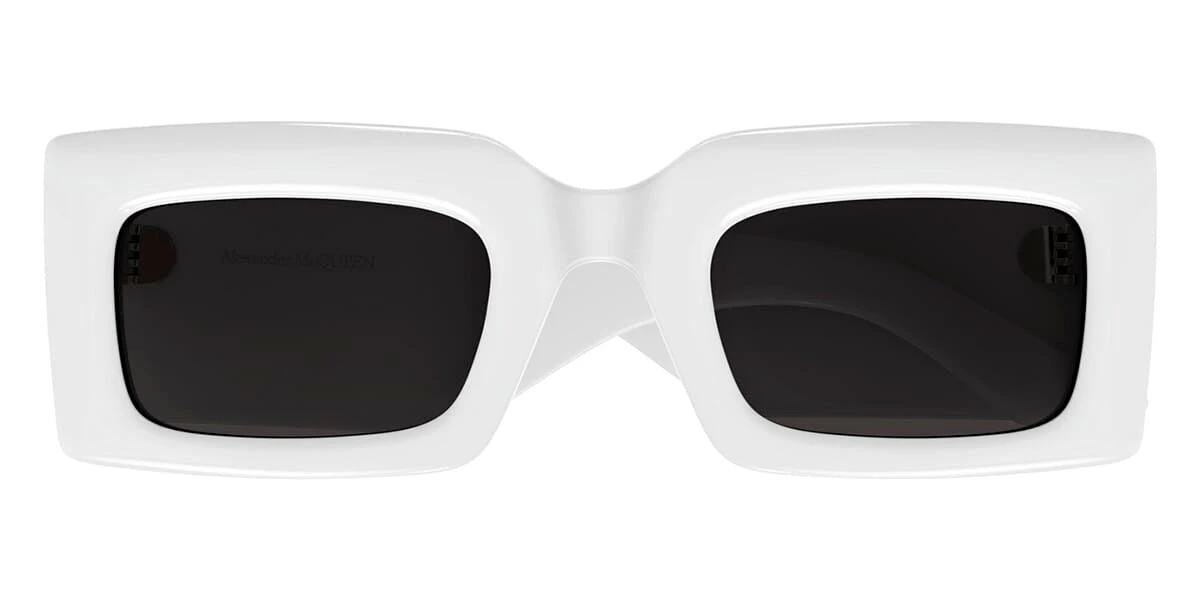 This square Alexander McQueen sunglass comes in a white frame with grey lenses.