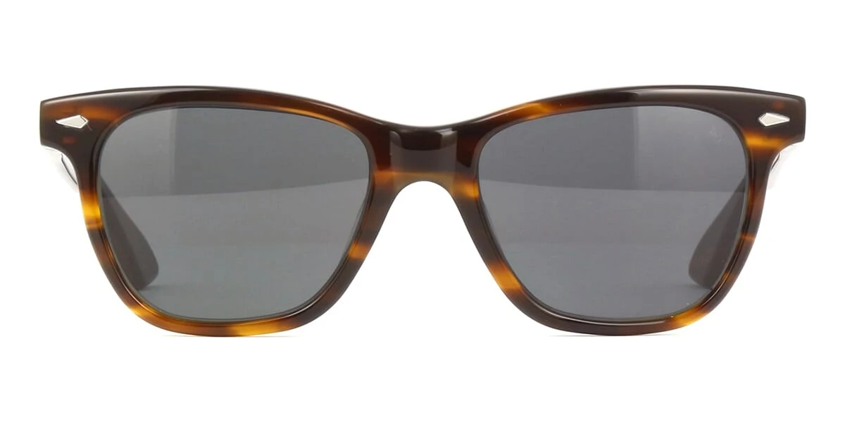 This wayfarer American Optical sunglass comes in a brown demi frame with grey aolite nylon lenses.