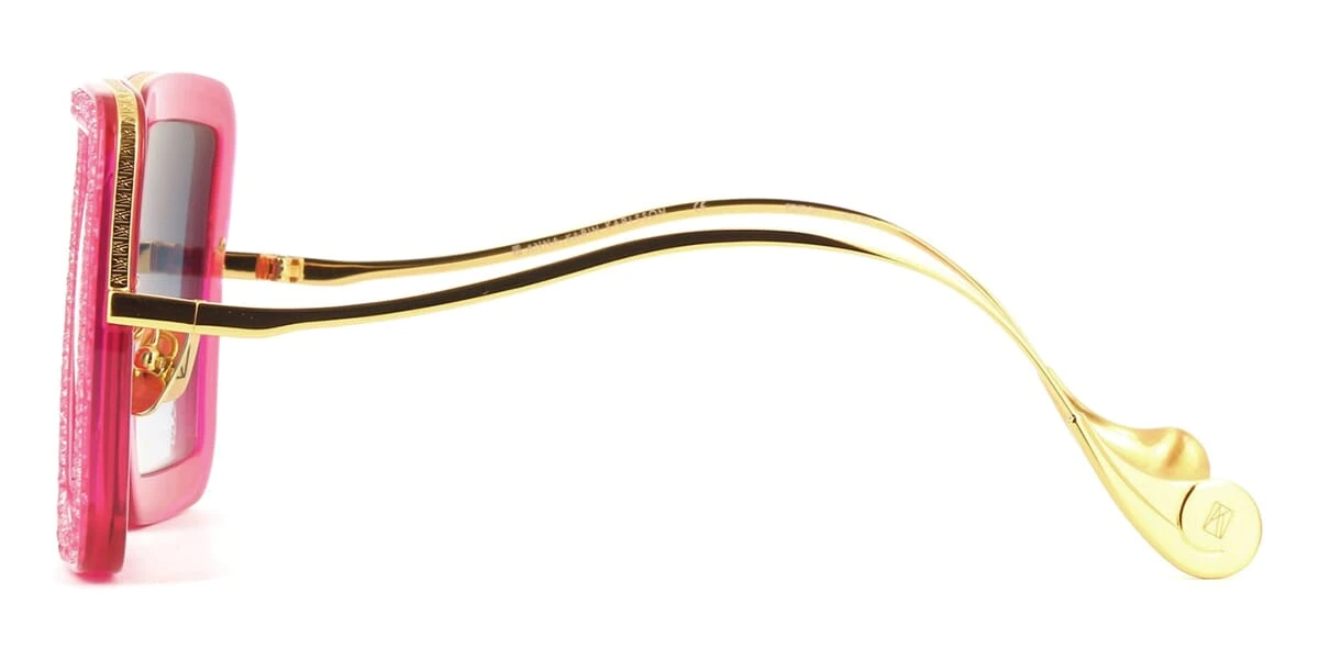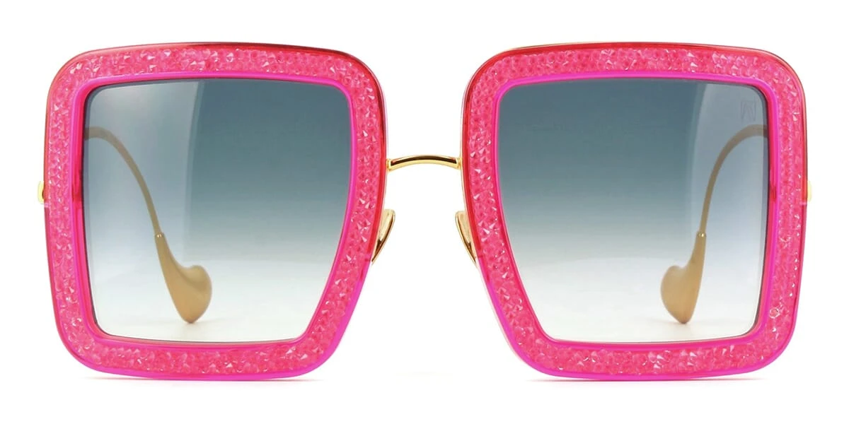 This square Anna-Karin Karlsson sunglass comes in a shiny pink and gold frame with blue gradient with light mirror lenses.