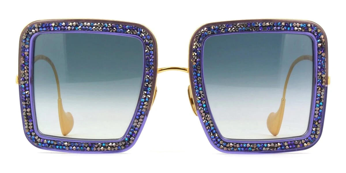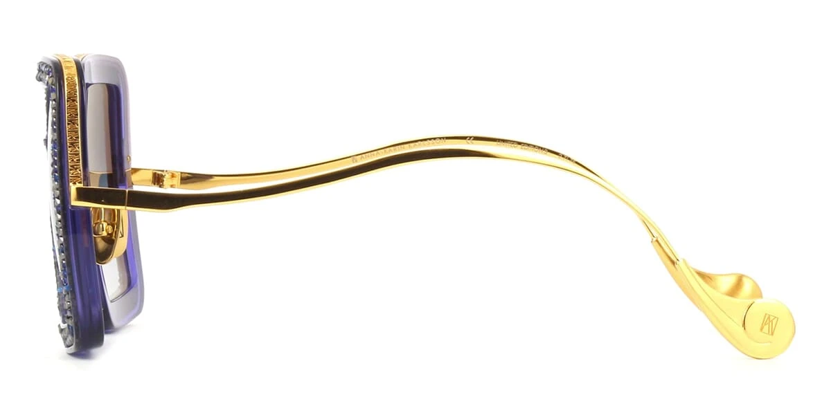 This square Anna-Karin Karlsson sunglass comes in a purple crystal and gold frame with blue gradient lenses.