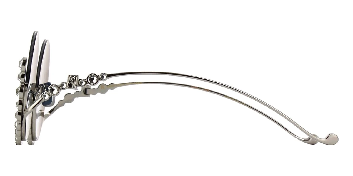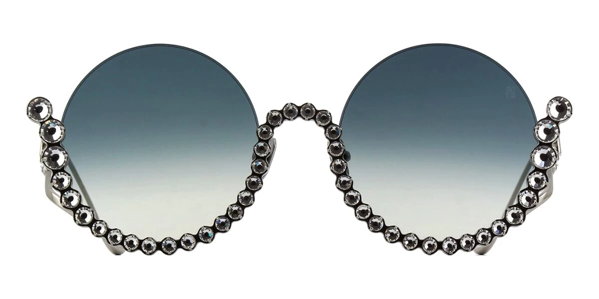 This round Anna-Karin Karlsson sunglass comes in a white gold with crystals frame with blue gradient lenses.