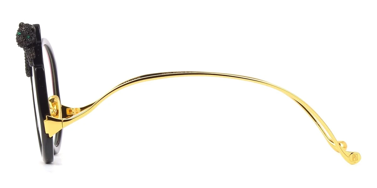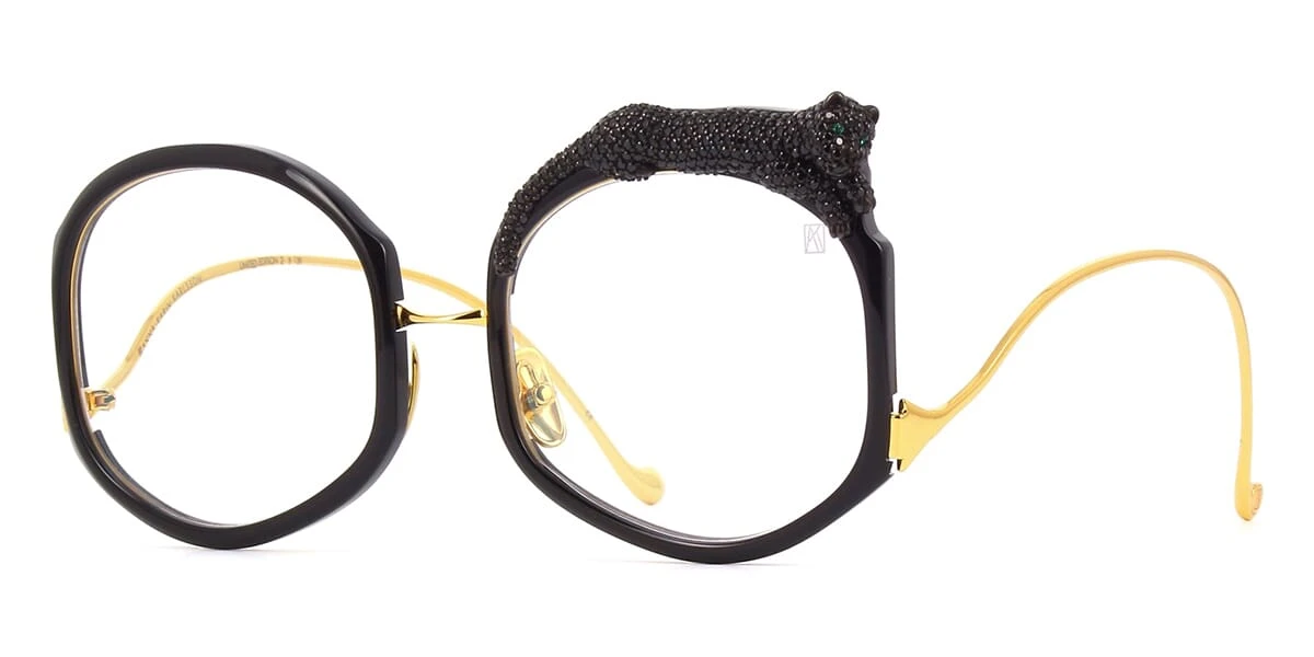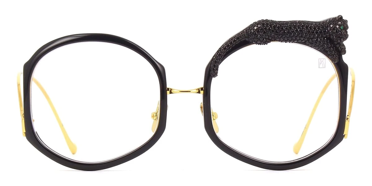 This round Anna-Karin Karlsson optical comes in a black crystal and gold frame.