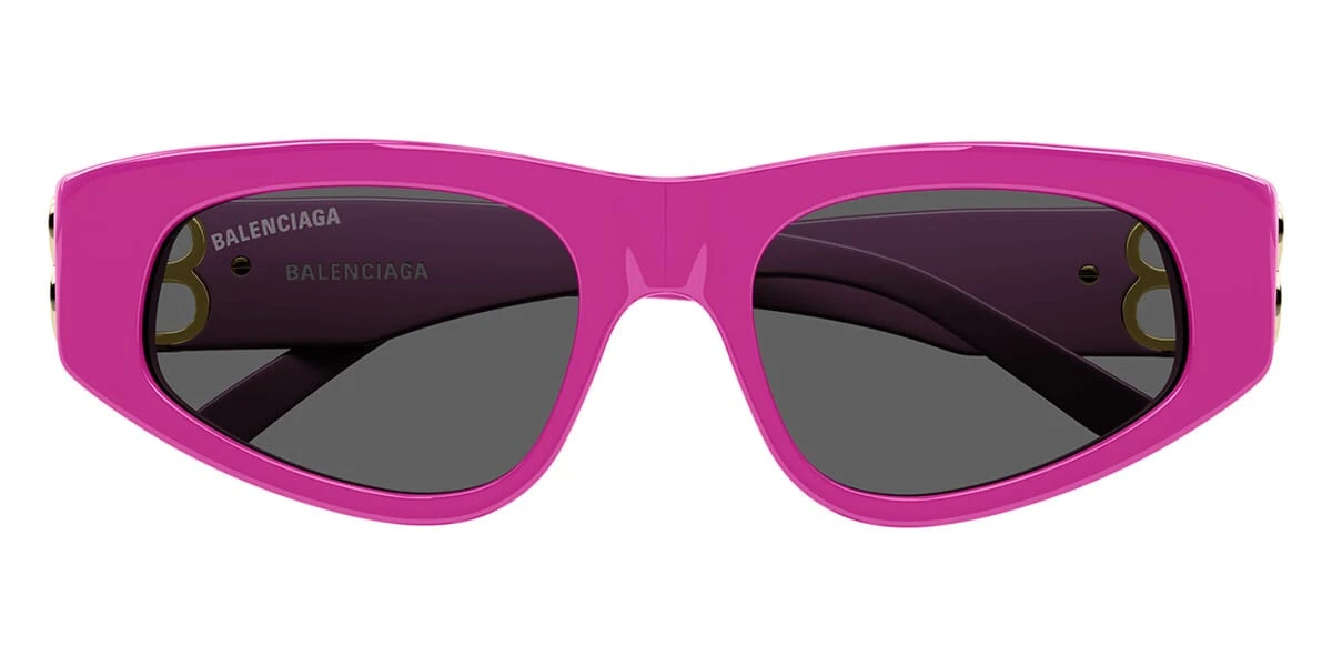 This cat eye Balenciaga sunglass comes in a pink with gold frame with grey solid tint lenses.