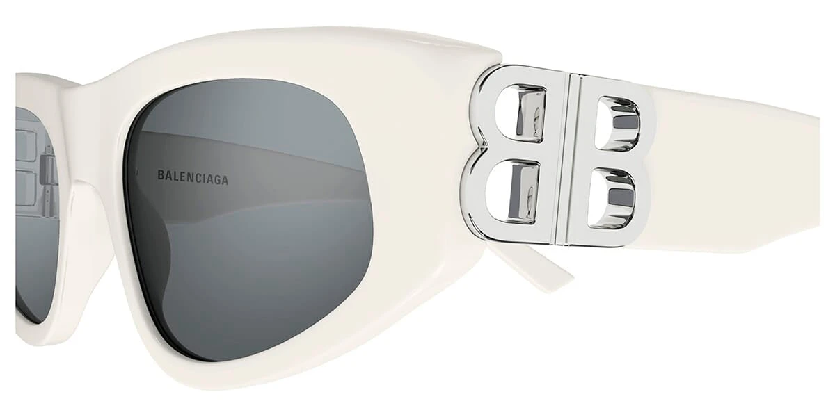 This square Balenciaga sunglass comes in a white with silver frame with grey with silver mirror lenses.