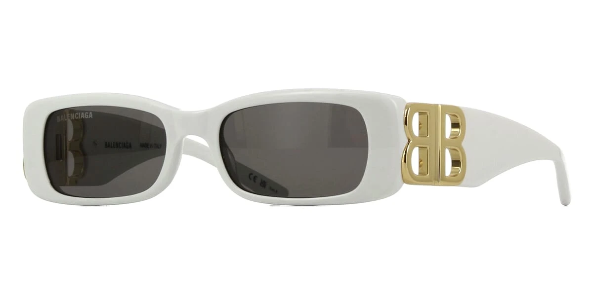 This rectangular Balenciaga sunglass comes in a white with gold frame with grey lenses.