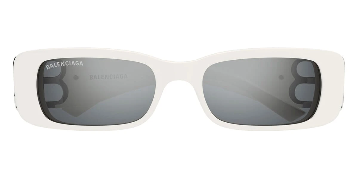 This square Balenciaga sunglass comes in a white with silver frame with grey with silver mirror lenses.