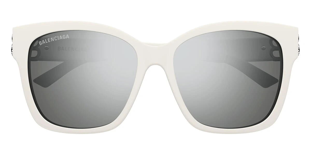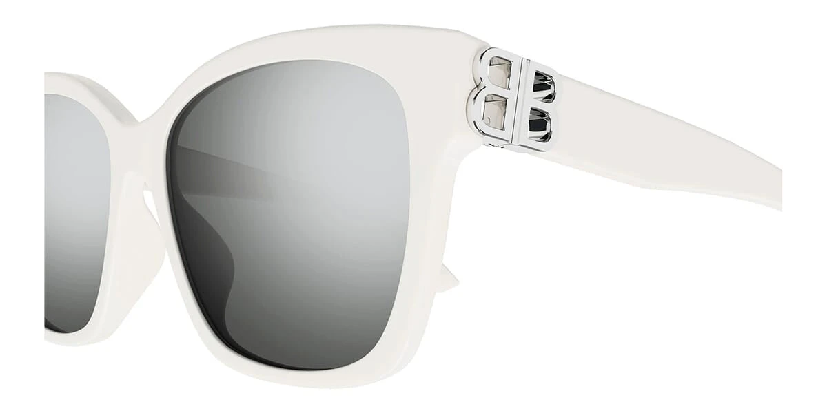 This square Balenciaga sunglass comes in a white with silver frame with grey with silver mirror lenses.