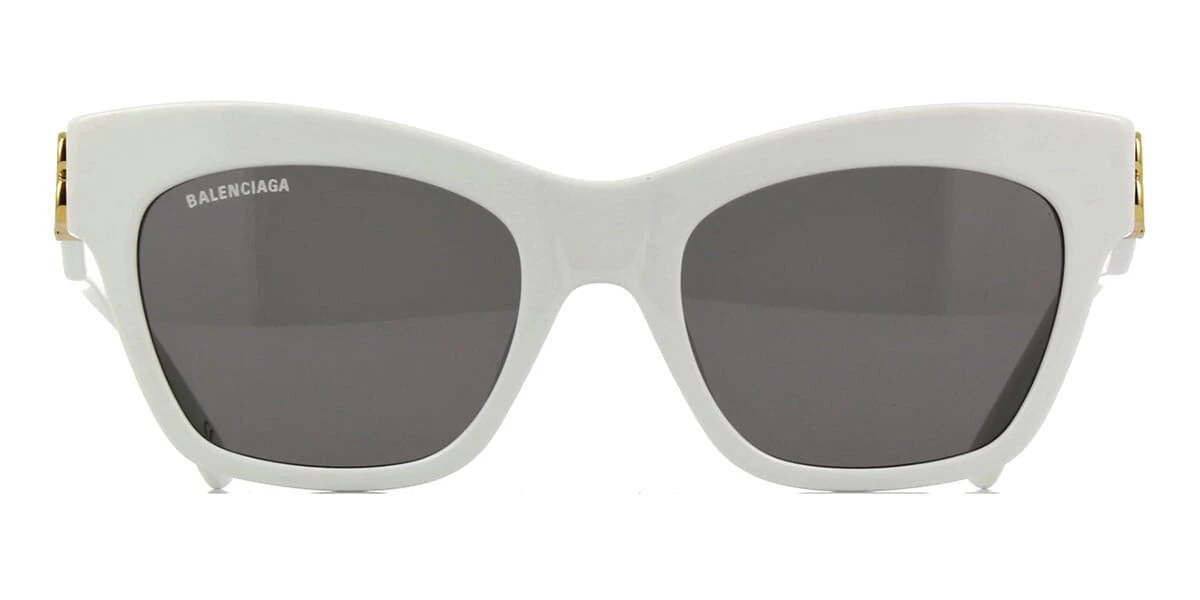 This cat eye Balenciaga sunglass comes in a white and gold frame with grey lenses.