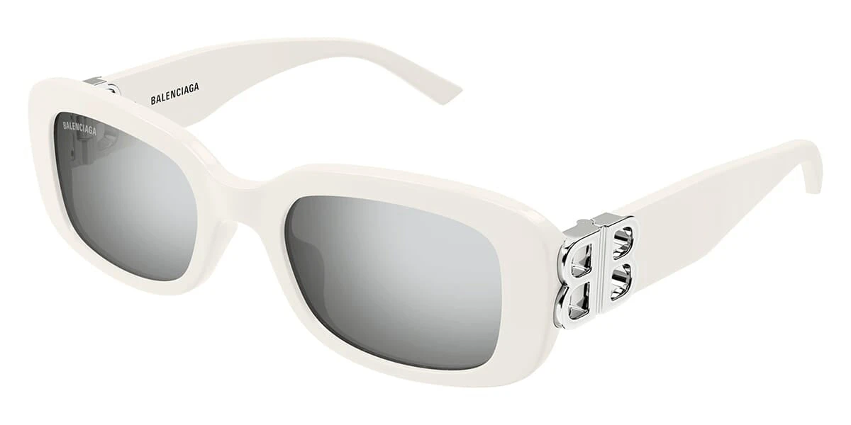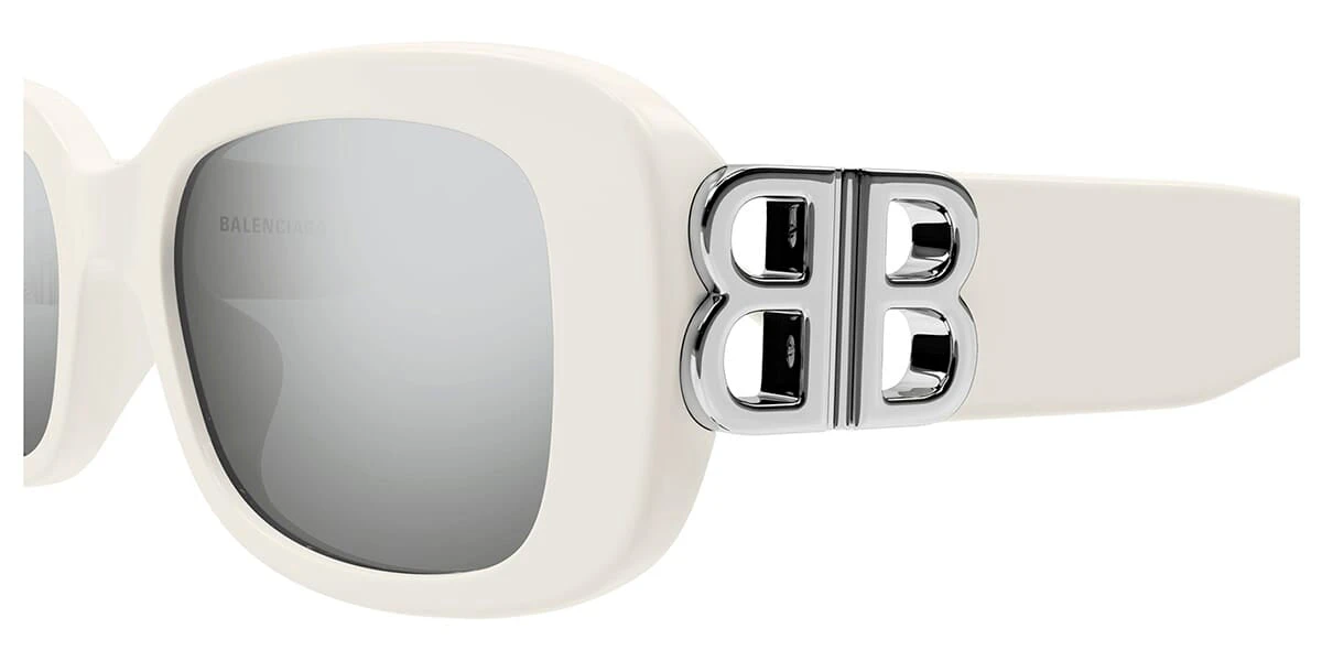 This square Balenciaga sunglass comes in a white with silver frame with grey with silver mirror lenses.