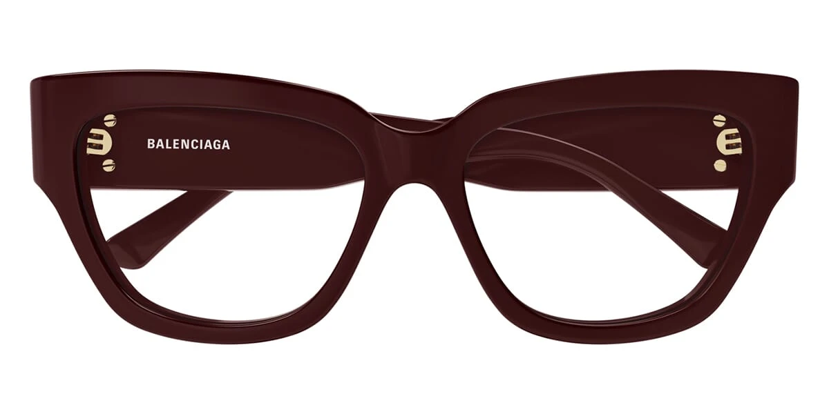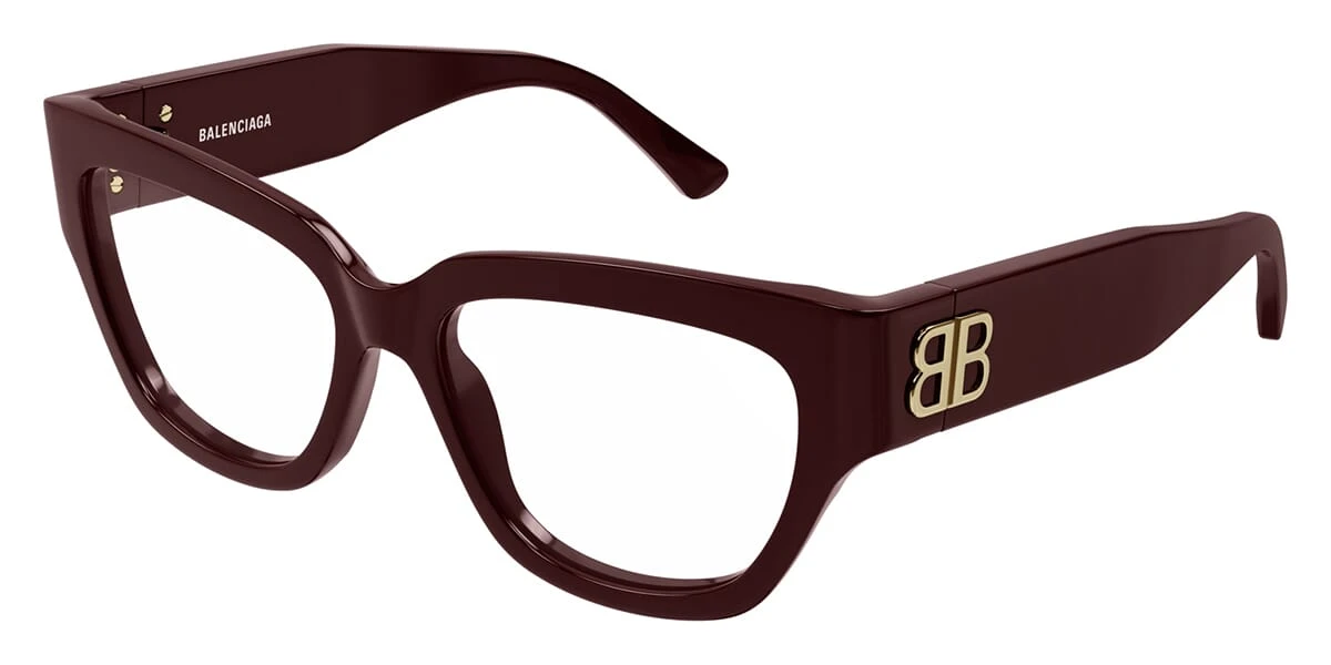This cat eye Balenciaga optical comes in a burgundy with gold frame.
