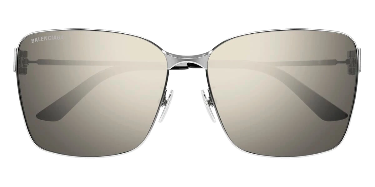 This square Balenciaga sunglass comes in a silver frame with brown with silver mirror lenses.