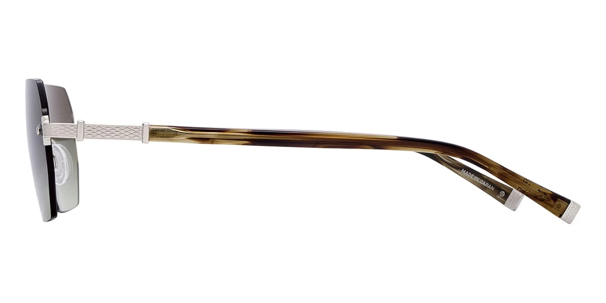 This square Barton Perreira sunglass comes in a silver and brown frame with green lenses.