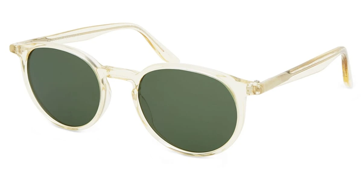 This square Barton Perreira sunglass comes in a champagne frame with bottle green lenses.