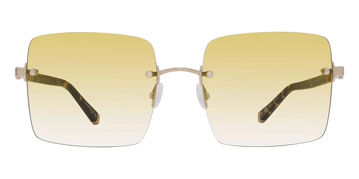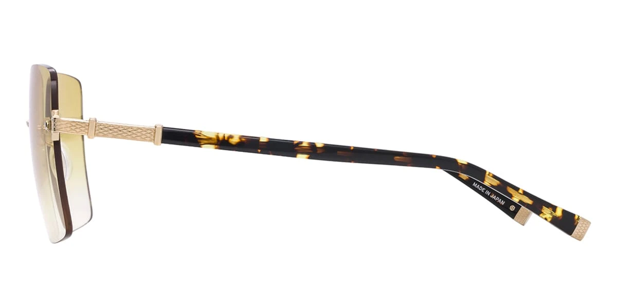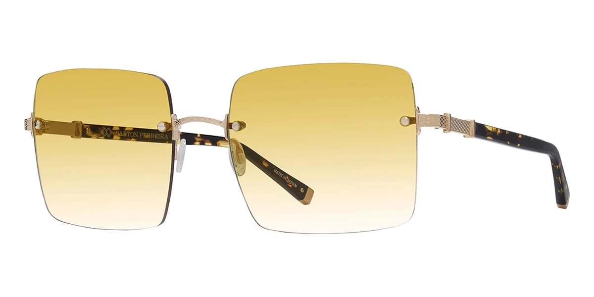 This square Barton Perreira sunglass comes in a gold and havana frame with yellow lenses.