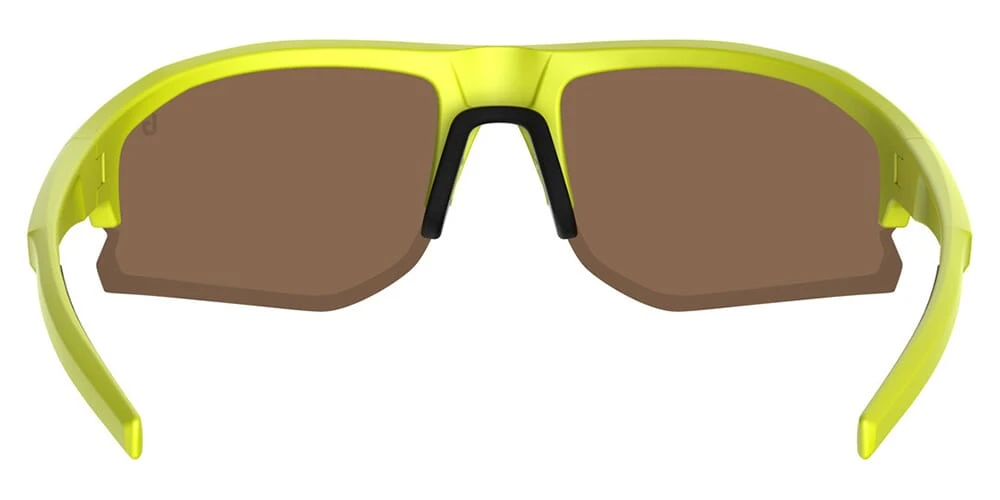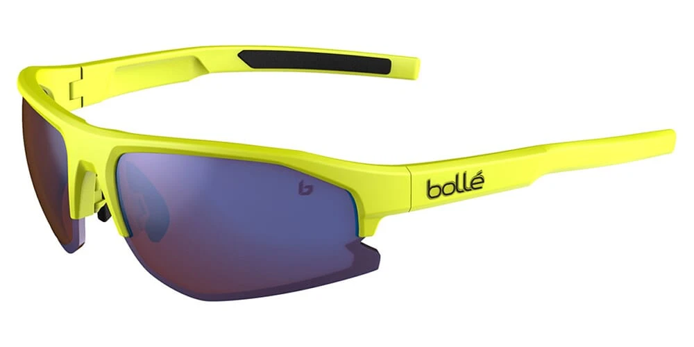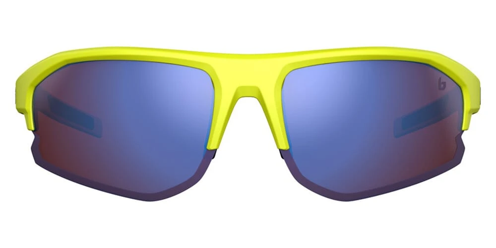 This rectangular Bolle sunglass comes in a acid yellow matte frame with brown solid tint cat 3 to 3 polarised with blue mirror lenses.