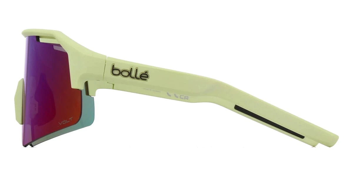 This shield Bolle sunglass comes in a matte creator green frame with brown with ultraviolet mirror volt high contrast oleophobic lenses.
