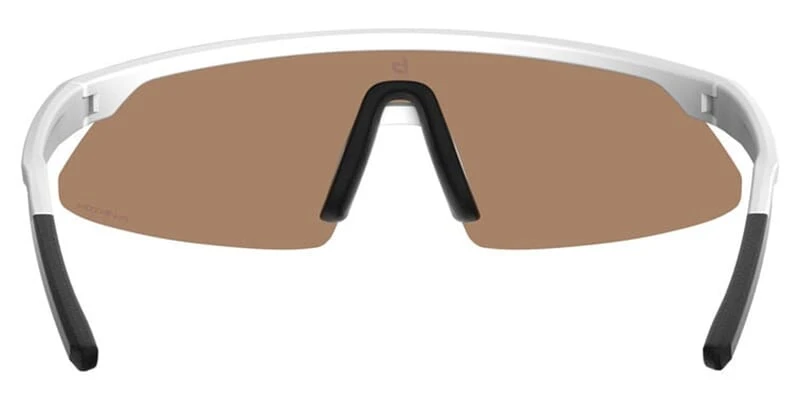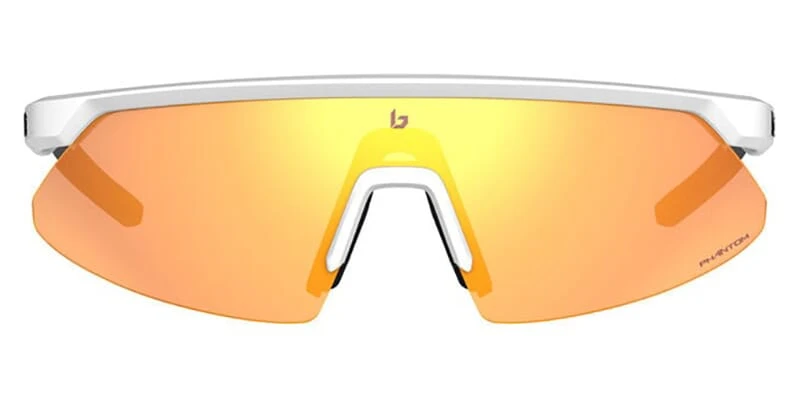 This wraparound Bolle sunglass comes in a white matte frame with phantom brown gun solid tint cat 2 to 3 with red photochromic flash mirror lenses.