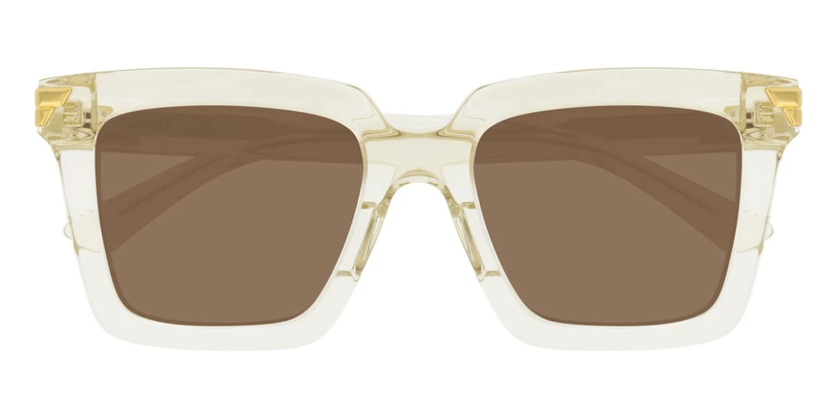 This square Bottega Veneta sunglass comes in a transparent beige frame with brown lenses.
