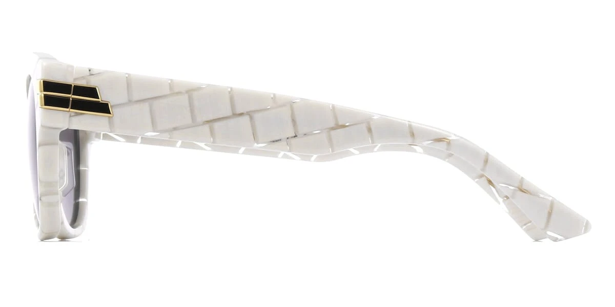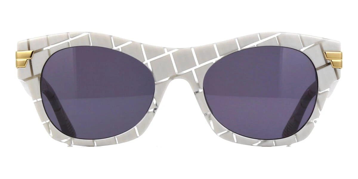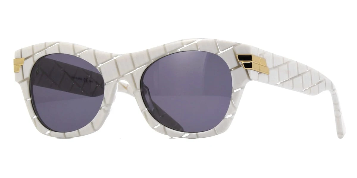 This cat eye Bottega Veneta sunglass comes in a ivory cubed frame with grey lenses.