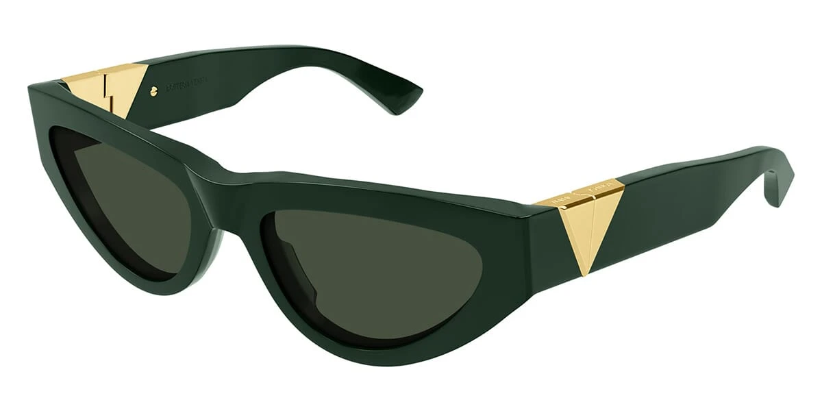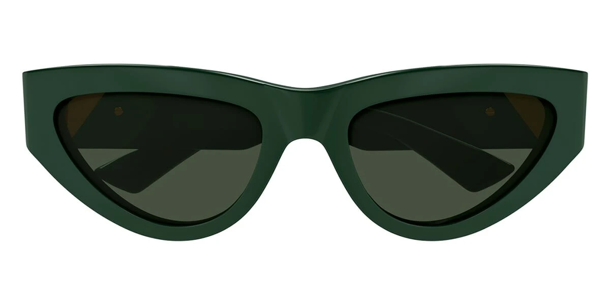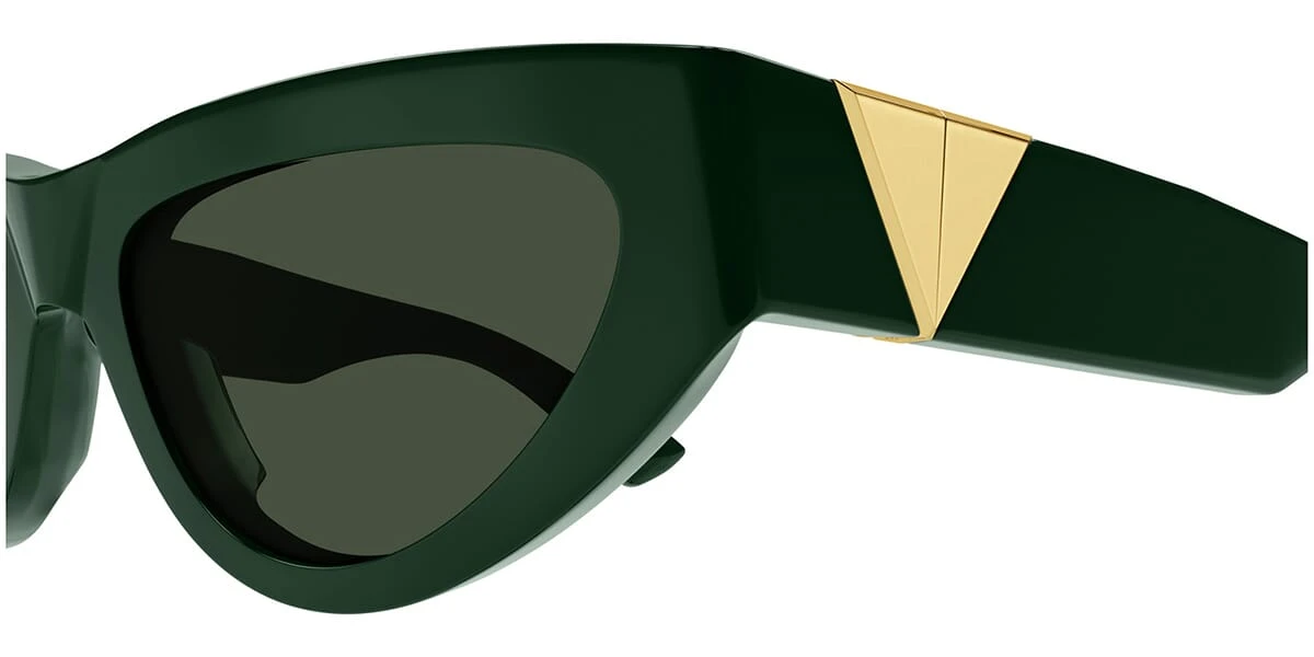 This cat eye Bottega Veneta sunglass comes in a green with gold frame with green lenses.