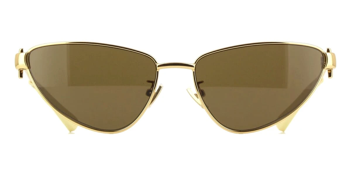 This cat eye Bottega Veneta sunglass comes in a shiny gold frame with dark brown with light mirror lenses.