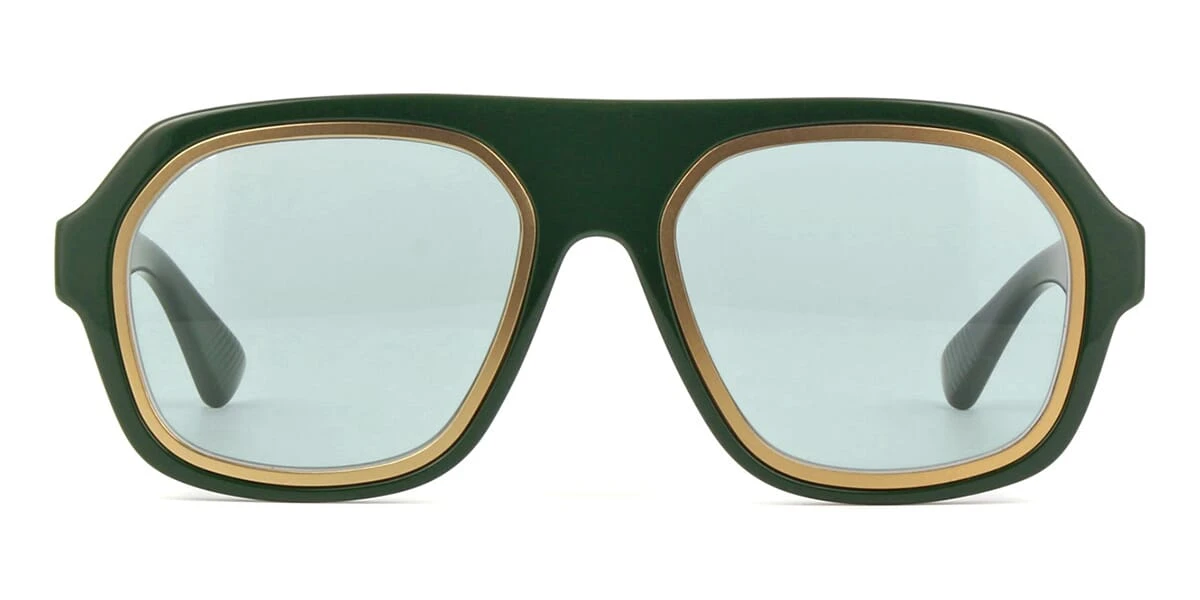 This square Bottega Veneta sunglass comes in a shiny dark green with gold frame with light green lenses.