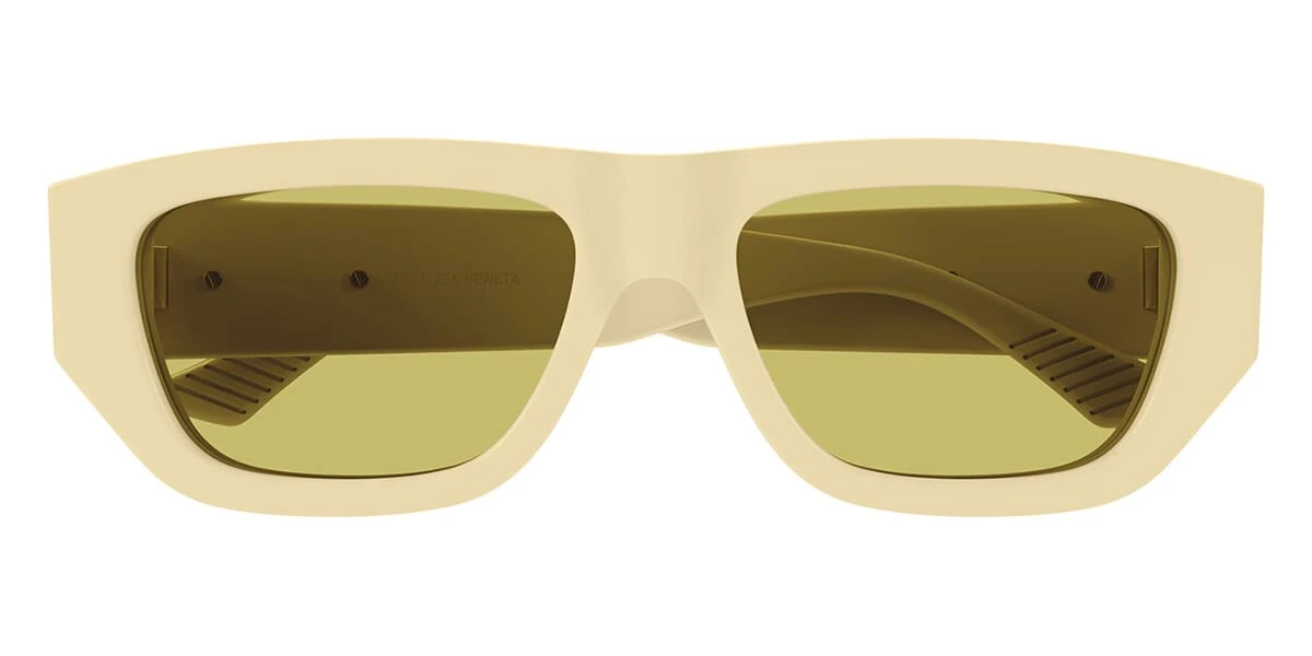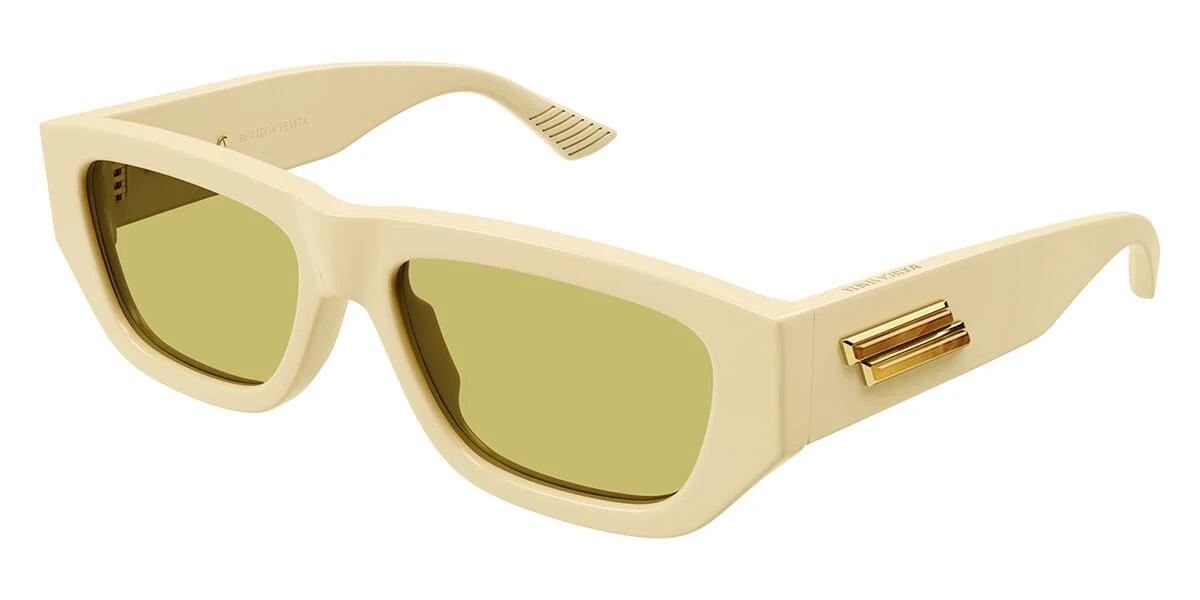 This square Bottega Veneta sunglass comes in a ivory white with gold frame with yellow lenses.