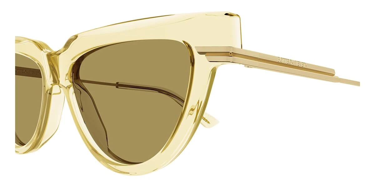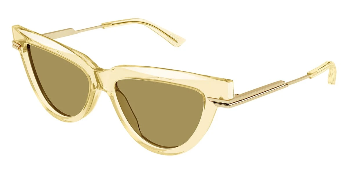 This cat eye Bottega Veneta sunglass comes in a crystal yellow with gold frame with brown lenses.