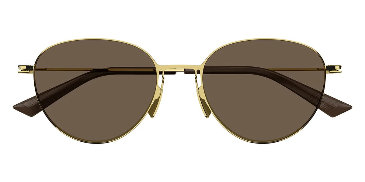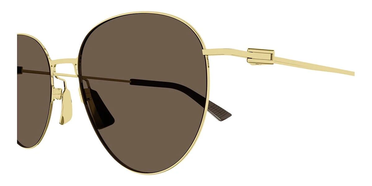 This square Bottega Veneta sunglass comes in a gold frame with brown lenses.