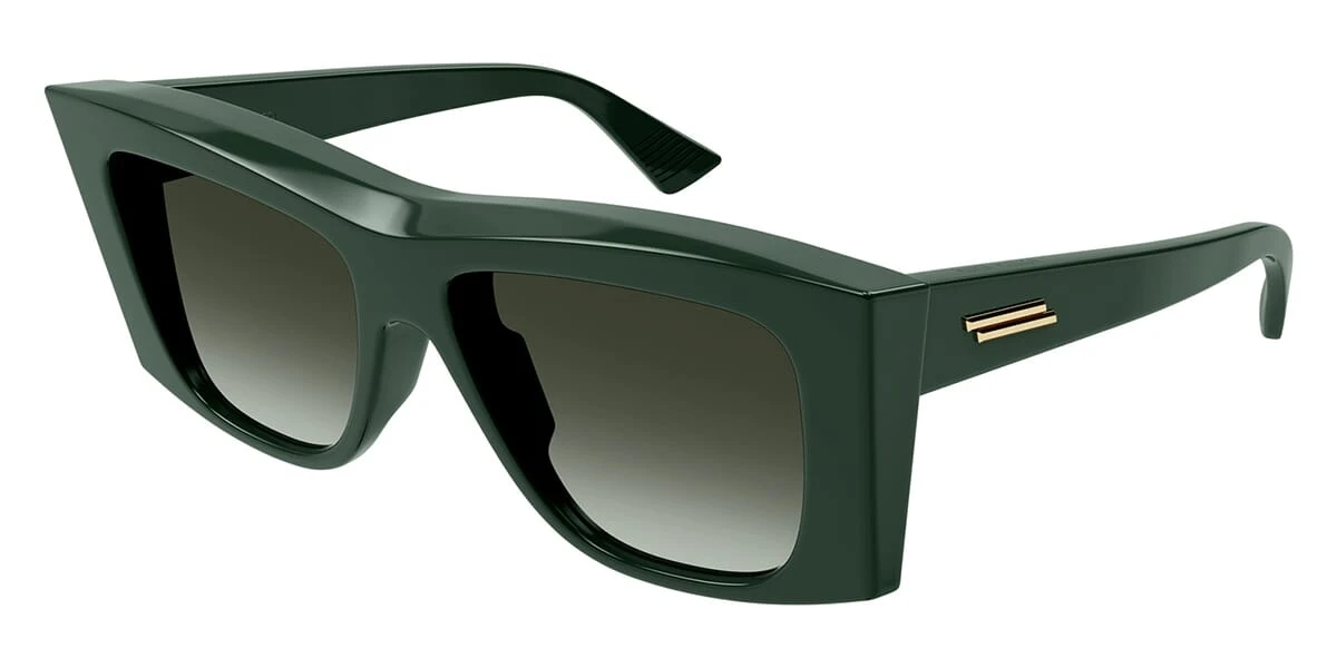 This square Bottega Veneta sunglass comes in a green with gold frame with green lenses.