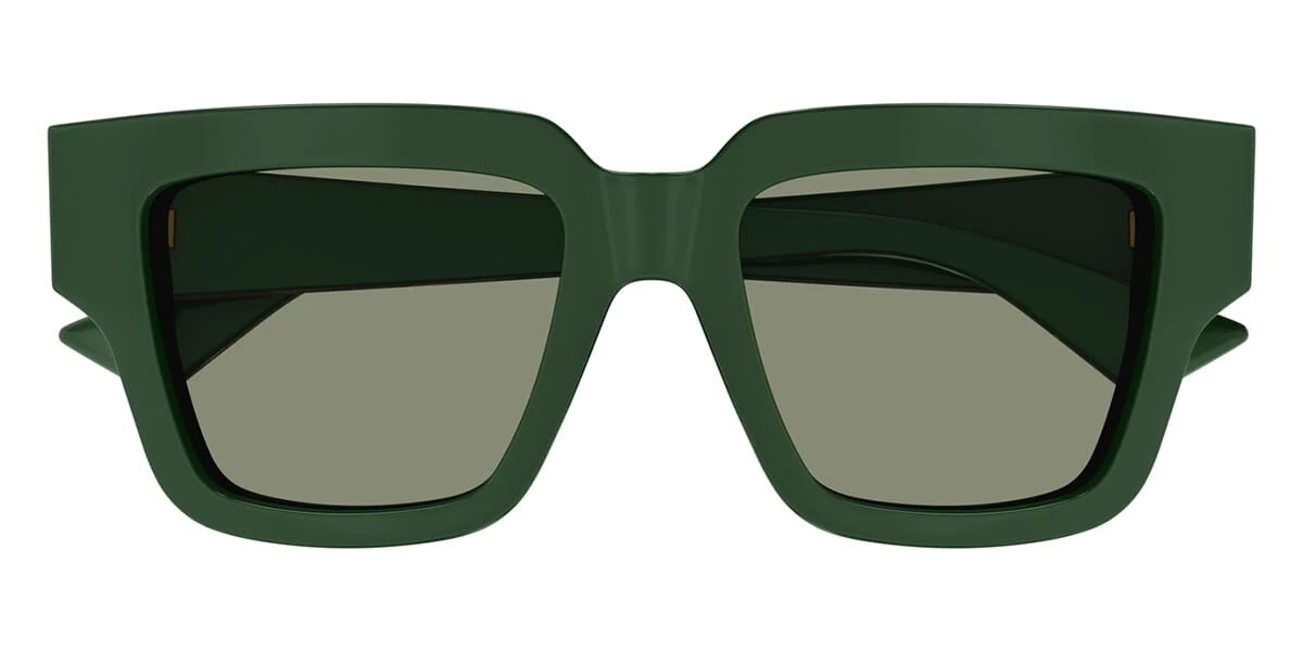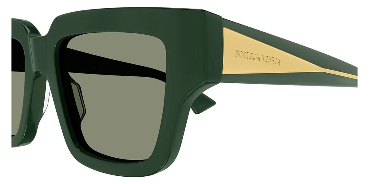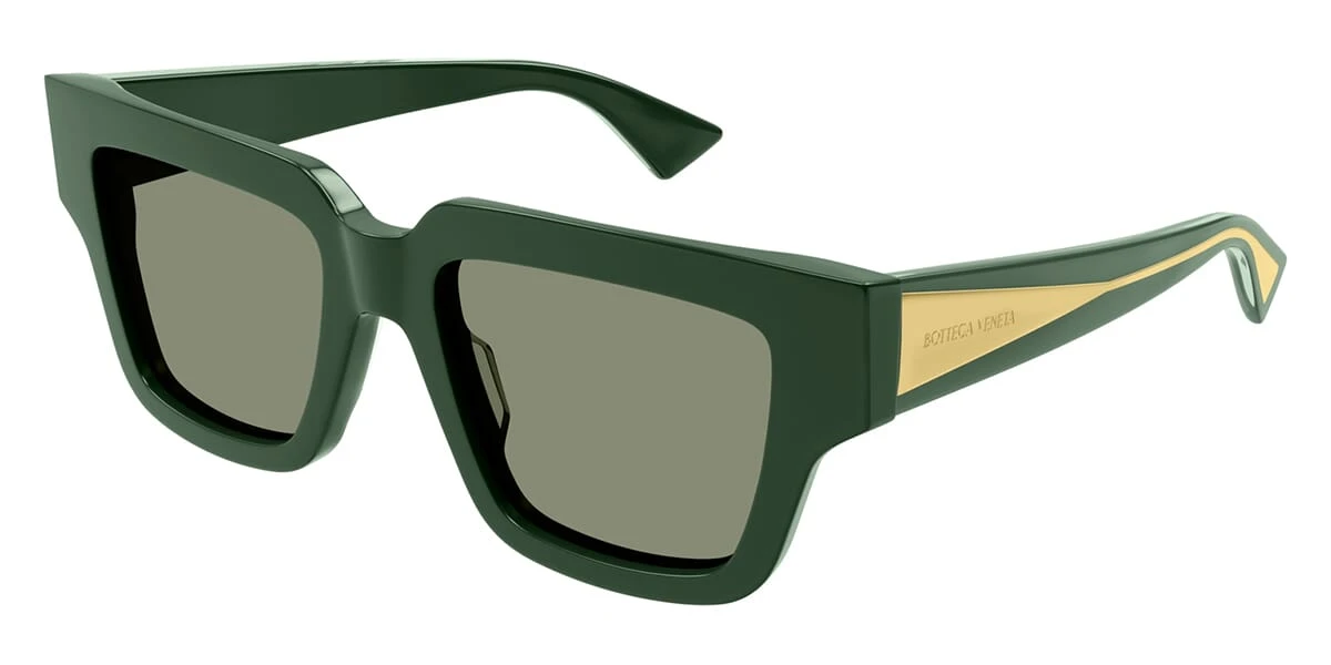 This square Bottega Veneta sunglass comes in a shiny forest green crystal with gold frame with green lenses.