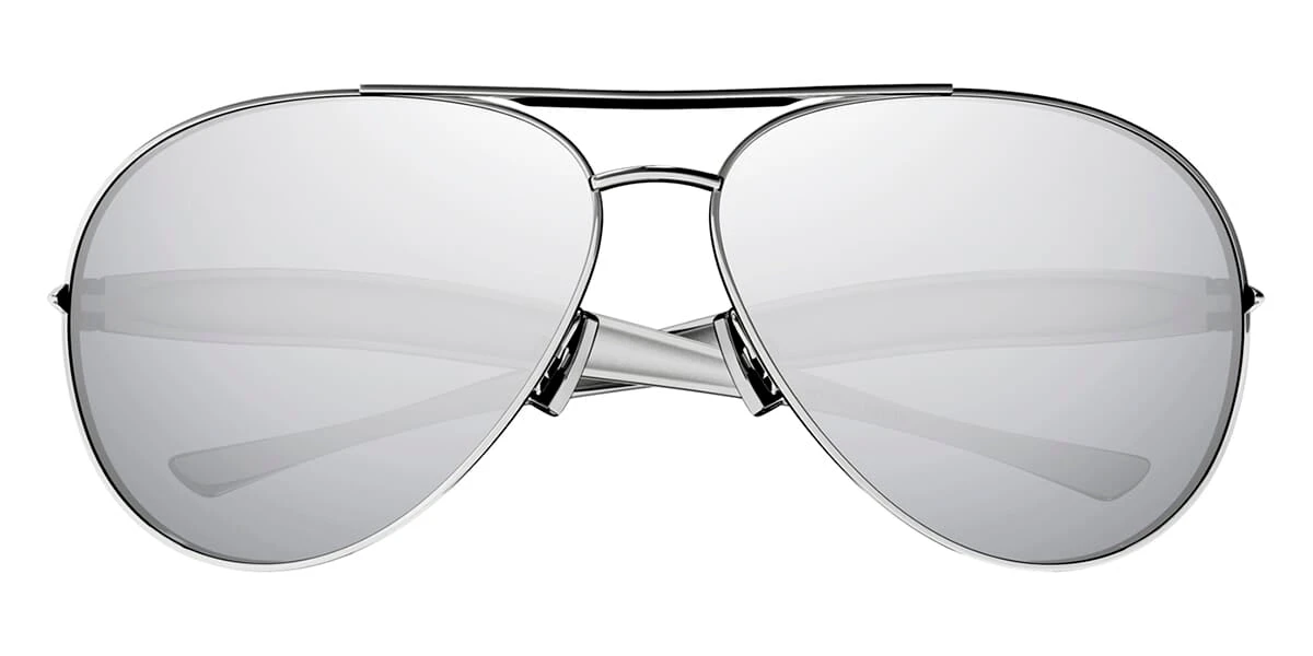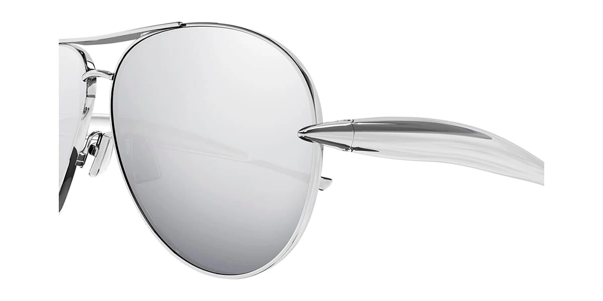 This aviator Bottega Veneta sunglass comes in a silver frame with grey with silver mirror lenses.