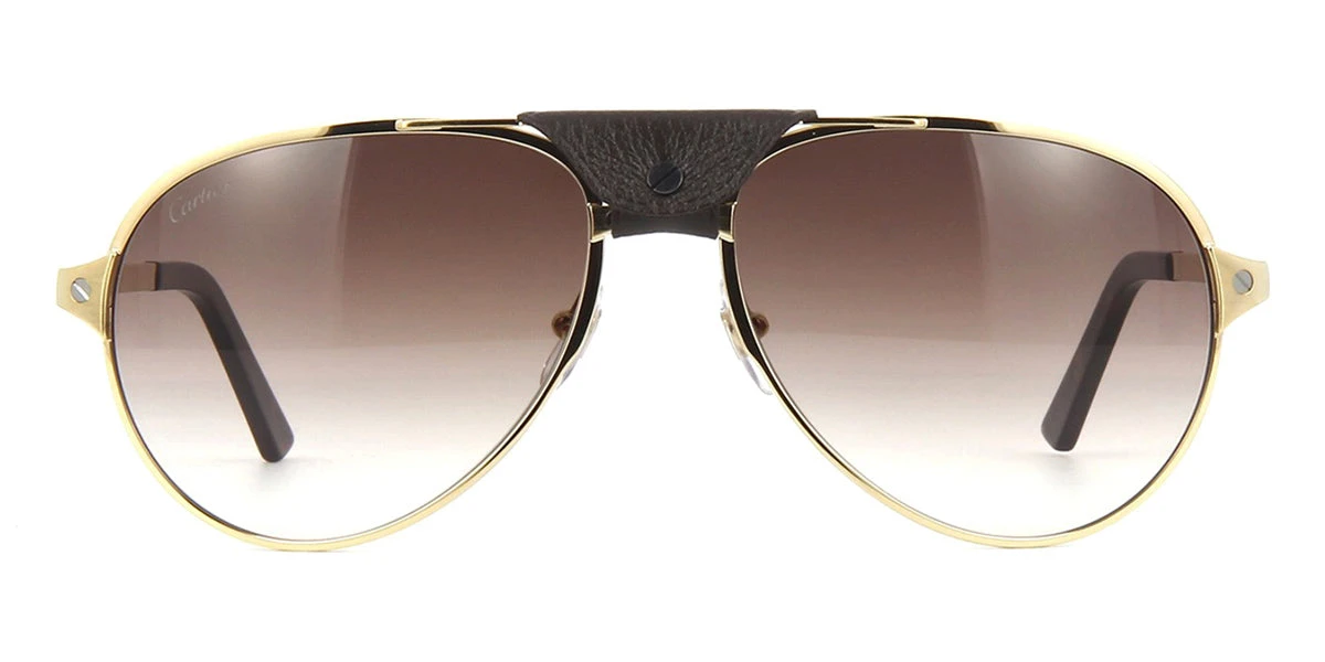 This aviator Cartier sunglass comes in a gold with dark brown calfskin leather frame with brown gradient lenses.