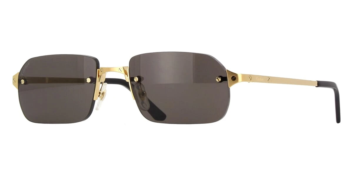 This square Cartier sunglass comes in a shiny gold frame with grey with light mirror lenses.