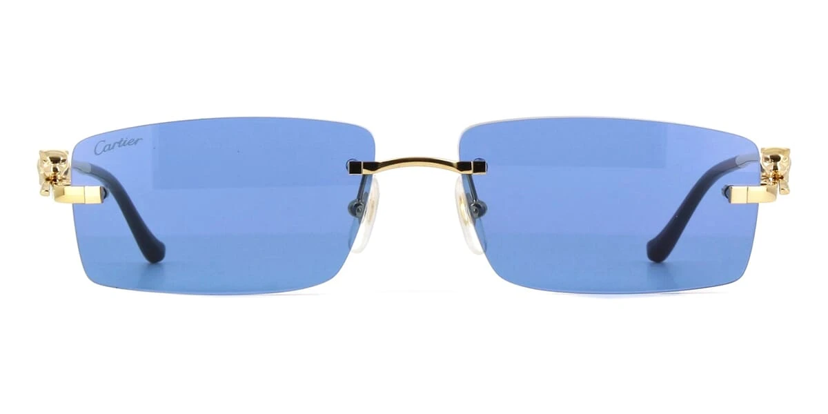 This rectangular Cartier sunglass comes in a shiny gold frame with blue with light mirror lenses.