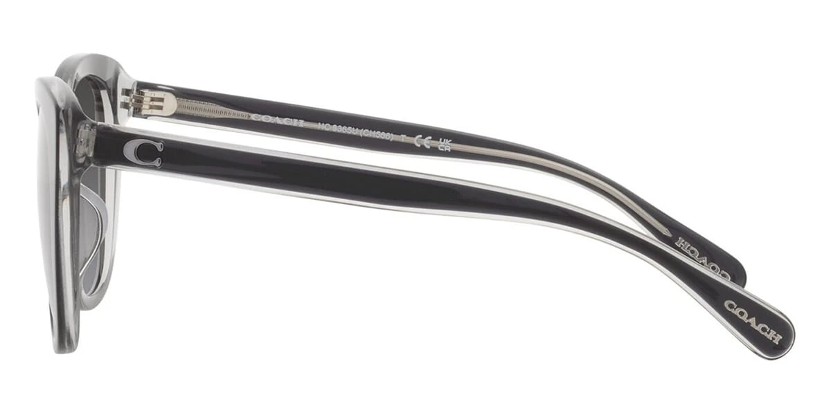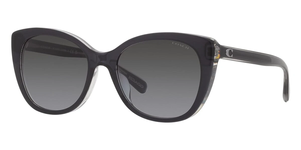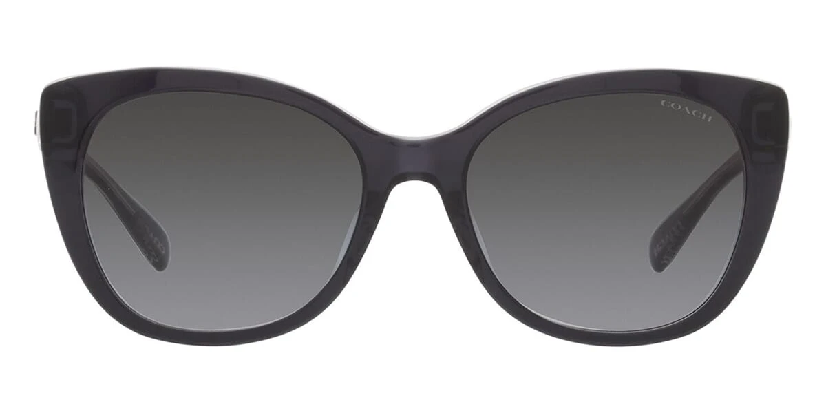 This cat eye Coach sunglass comes in a black and grey crystal frame with grey gradient lenses.