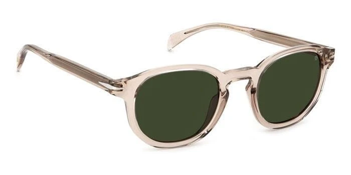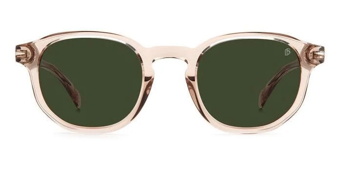 This round David Beckham sunglass comes in a transparent mud with gold frame with green lenses.
