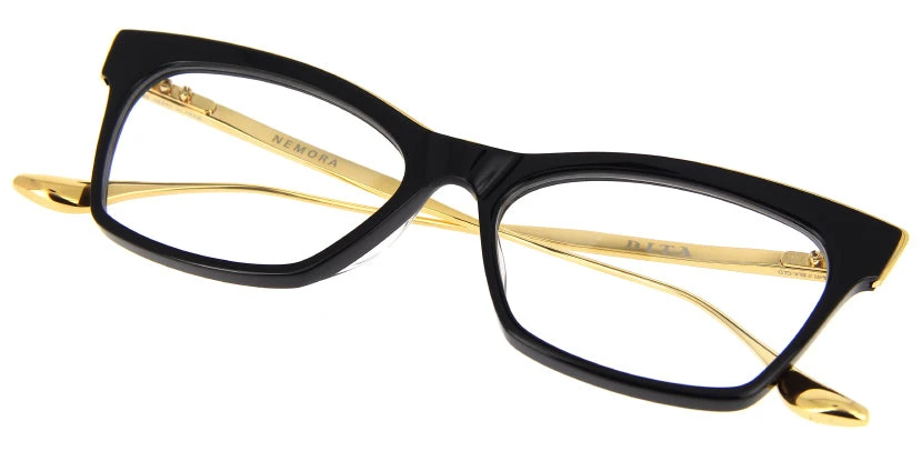 This cat eye Dita optical comes in a black and yellow gold frame.
