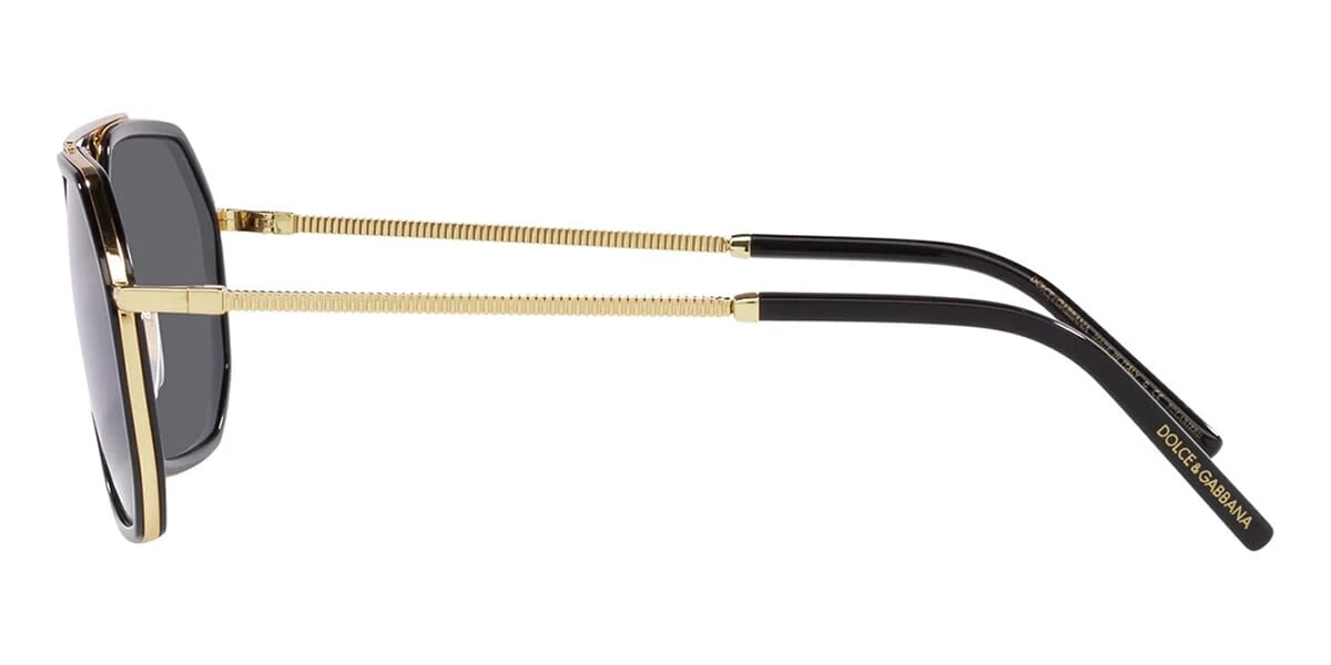 This aviator Dolce&Gabbana sunglass comes in a gold with black frame with grey polarised lenses.