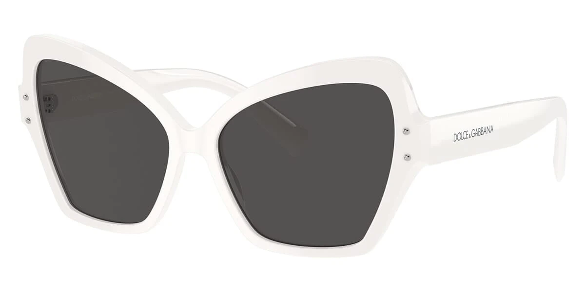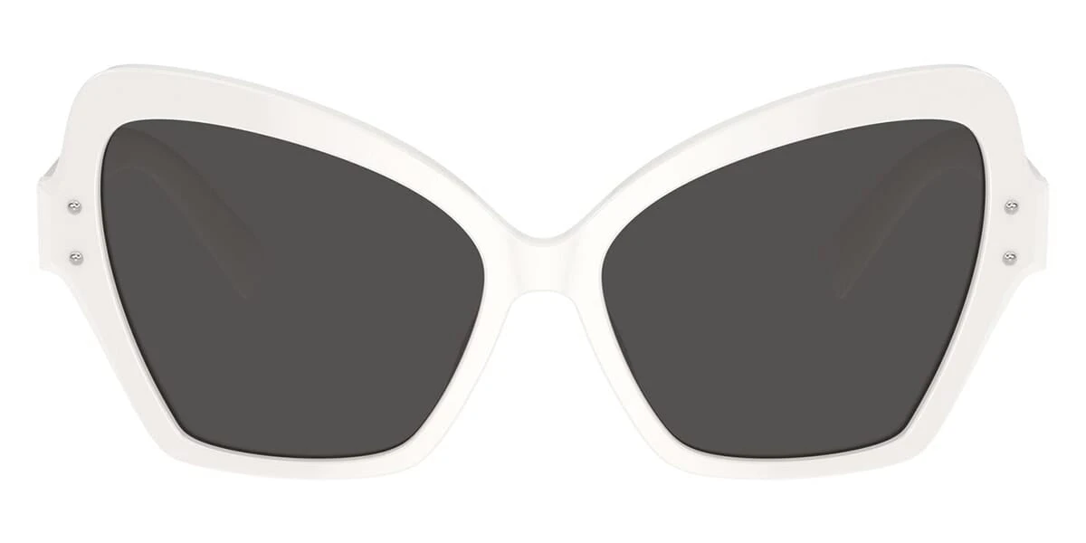 This butterfly Dolce&Gabbana sunglass comes in a white frame with dark grey lenses.