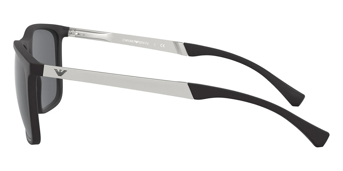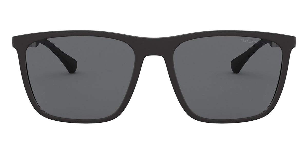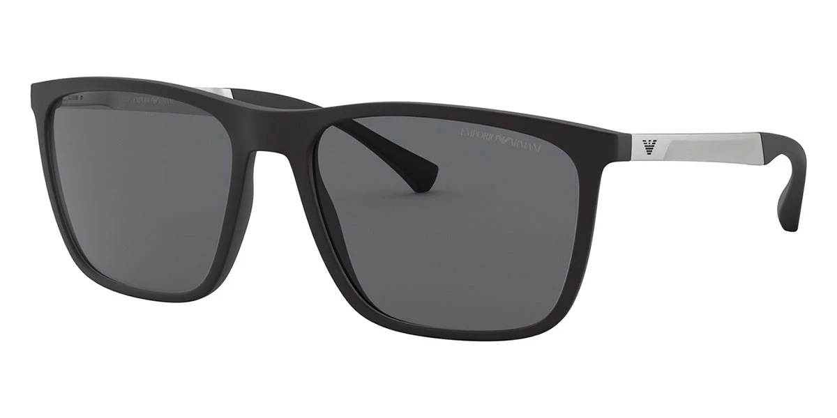 This rectangular Emporio Armani sunglass comes in a rubber black frame with grey lenses.