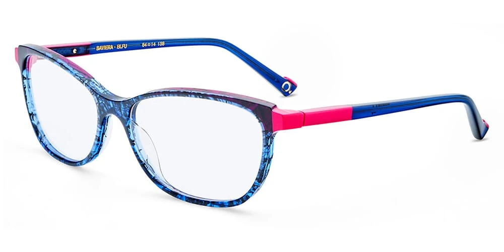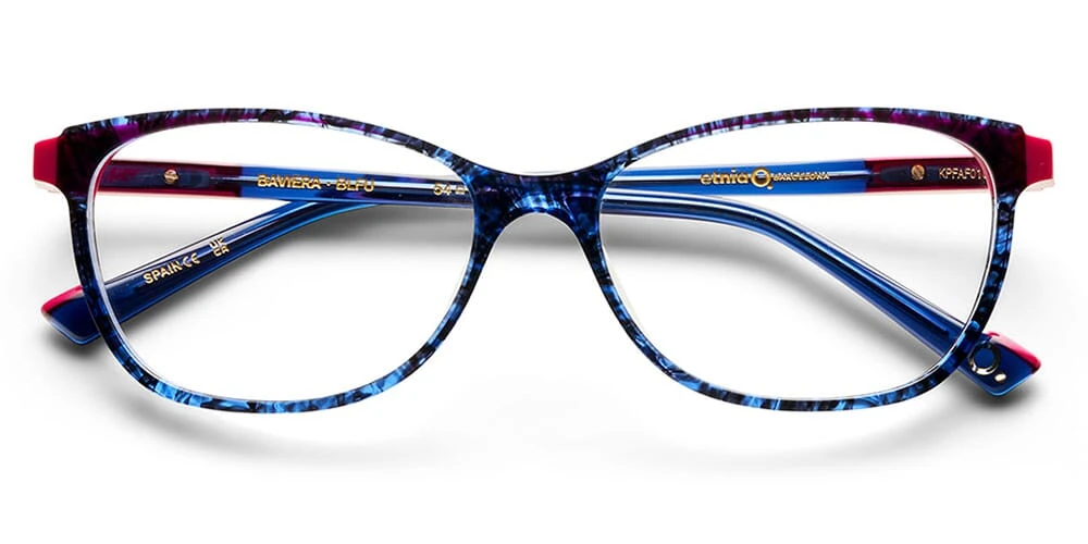 This cat eye Etnia Barcelona optical comes in a dark crystal blue havana with pink frame.
