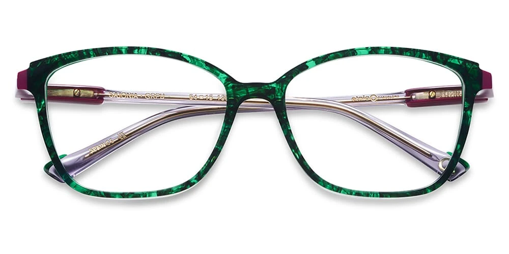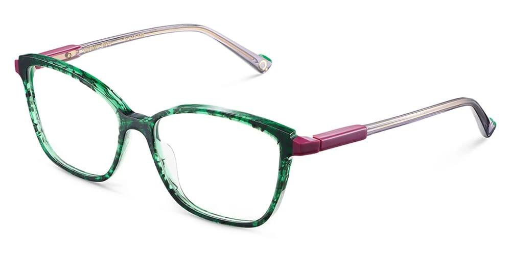 This square Etnia Barcelona optical comes in a crystal dark green havana with fuscia pink frame.