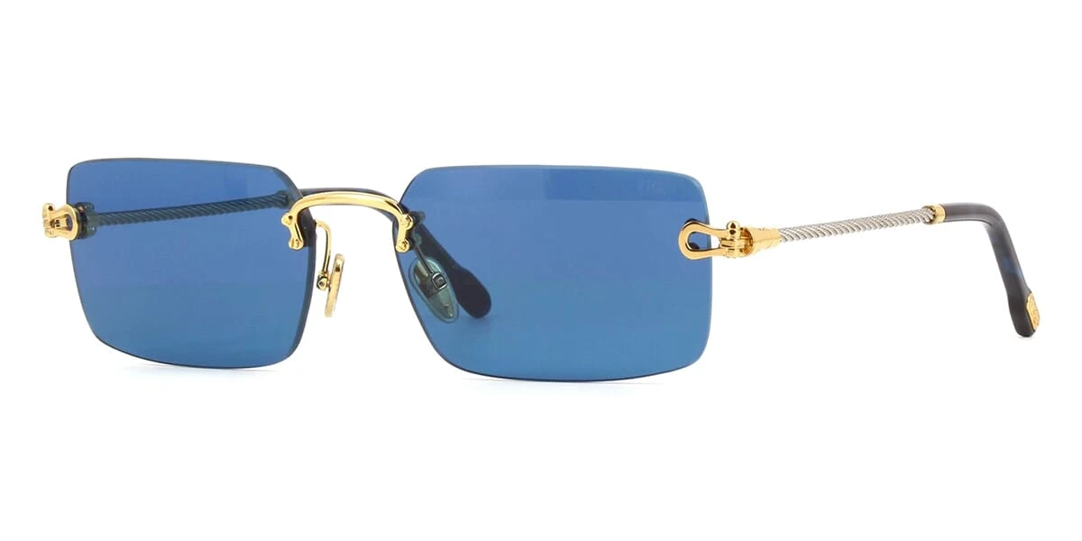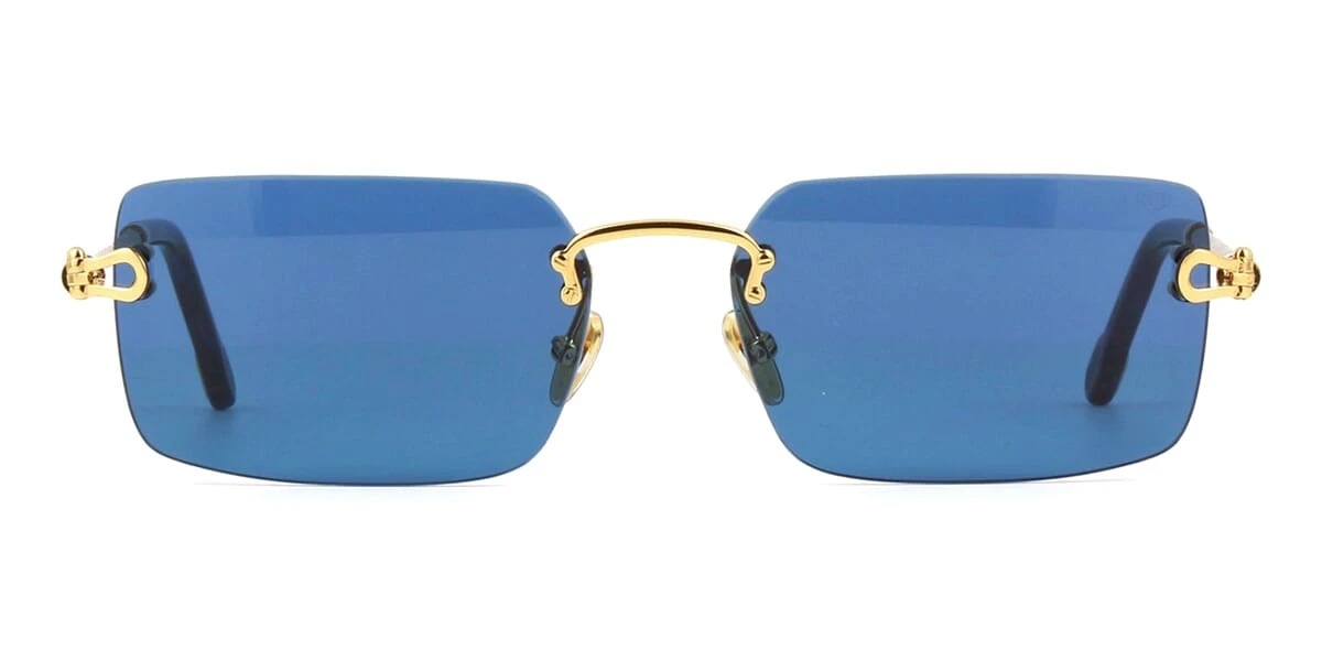 This rectangular Fred sunglass comes in a gold frame with blue lenses.