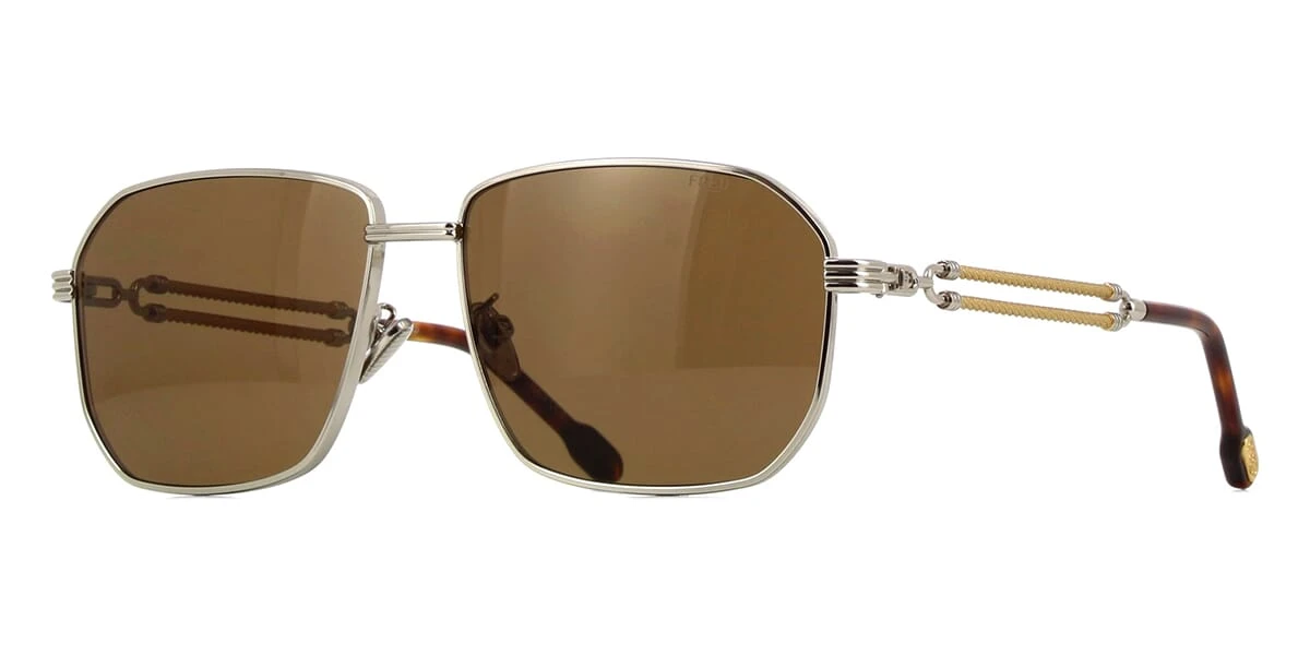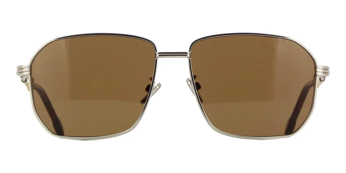 This square Fred sunglass comes in a shiny silver frame with brown with light mirror lenses.