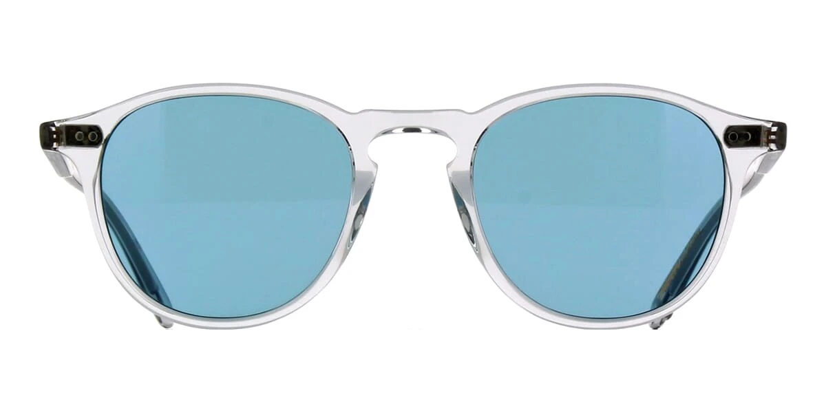 This round Garrett Leight sunglass comes in a bio smoke frame with bio sky lenses.